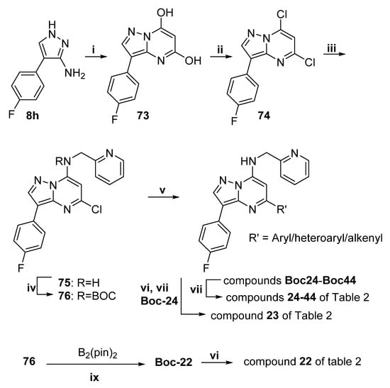 Compounds 22–44 of Table 2 (Scheme 2) were prepared from commercial 4-(4-fluorophenyl)-1H-pyrazol-5-amine (8h) by reacting it with diethyl malonate/sodium ethoxide to give the diol (73), which was converted to the dichloride (74). The chloride at the 7 position was selectively displaced with 2-pyridinemethanamine to give 75, BOC-protection of the amine gave 76, which subsequently underwent Suzuki coupling with various aryl and heteroaryl boronic acids to give Boc24–Boc44. The Suzuki coupling was unsuccessful under a variety of conditions when 75 was used, and this necessitated the use of the Boc-protected derivative 76.