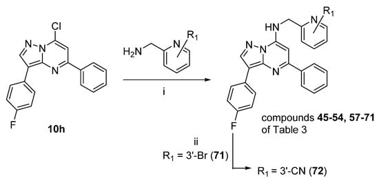 Preparation of compounds 45–54, 57–71 of Table 3. Reagents and conditions: (i) DIPEA, iPrOH, reflux, 3–15h; (ii) Zn(CN)2, Pd(PPh3)4, DMF, 115 °C.