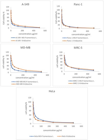 Demonstrated dose response profile of the plant latex from P. tomentosa L. on the cell viability of A-495, Panc-1, MDA-MB-231, MRC-5, and HeLa cell lines following incubation for 24 h. All data are represented as the mean ± SD, n = 3.