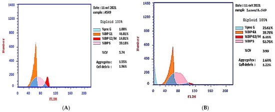 Photograph of the flow cytometry analysis shows the effect of 3.8 µg/mL of the plant latex of P. tomentosa L. compared to the negative control on the phases of the cell cycle of the lung cancer cell line (A-549). (A) negative control and (B) plant latex of P. tomentosa L.