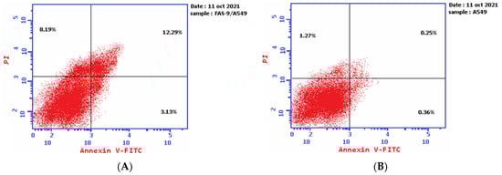 Demonstrated effect of P. tomentosa L. latex (IC50 = 3.8 ug/mL) (A) on the percentage of Annexin V-FITC-positive staining monolayer A-549 cells versus the control (B) using flow cytometry.