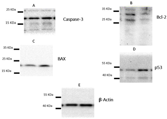 The immunoblot analysis of proteins (Western blot) technique was used to determine the apoptotic activity of the IC50 of plant latex against the cell line. Briefly, the total protein with volume of 20 µg was collected from treated and untreated cell lines for denaturation and electrophoretic separation, and the separated protein was transferred to a polyvinylidene fluoride (PVDF) membrane. The primary antibodies against Bax, Bcl-2, p53, and caspase-3 (The primary antibodies against BAX (1:1000, Cell Signaling Technology, Danvers, MA, USA), Bcl-2 (1:1500, Cell Signaling Technology), cleaved caspase-3 (1:500, Cell Signaling Technology), p53 (1:1000, Abcam, Cambridge, England), and β-actin (1:5000, Sigma, Madrid, Spain) were loaded to the gel membrane and incubated to form a protein–antibody complex at 4 °C. The membrane was washed and reintubated with a secondary antibody which bounded with enzyme to produce luminescence. The amount of luminescence is directly proportional to the amount of the protein that reacted with the antibody. The amount of luminescence was captured by a BioRad Imager [54,55].