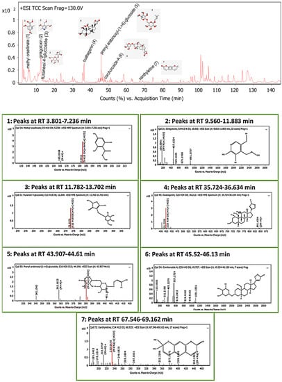 Base peak chromatogram of the identified bioactive metabolites in P. tomentosa L. latex: methyl orsellinate (1), ginkgotoxin (2), furaneol 4-glucoside (3), ouabagenin (4), prenyl arabinosyl-(1->6)-glucoside (5), corchoroside-A (6), and xanthyletine (7).