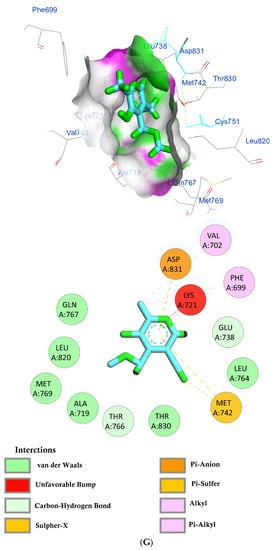 (A) Protein-ligand interactions of identified bioactive metabolites of P. tomentosa L. latex with the active site of EGFRK. Diagrams representing 3D and 2D protein–ligand interactions of ouabagenin with the active site of EGFRK. (B) Protein–ligand interactions of identified bioactive metabolites of P. tomentosa L. latex with the active site of EGFRK. Diagrams representing 3D and 2D protein–ligand interactions of corchoroside A. with the active site of EGFRK. (C) Protein–ligand interactions of identified bioactive metabolites of P. tomentosa L. latex with the active site of EGFRK. Diagrams representing 3D and 2D protein–ligand interactions of xanthyletine with the active site of EGFRK. (D) Protein–ligand interactions of identified bioactive metabolites of P. tomentosa L. latex with the active site of EGFRK. Diagrams representing 3D and 2D protein–ligand interactions of prenyl arabinosyl-(1->6)-glucoside with the active site of EGFRK. (E) Protein–ligand interactions of identified bioactive metabolites of P. tomentosa L. latex with the active site of EGFRK. Diagrams representing 3D and 2D protein–ligand interactions of furaneol 4-glucoside with the active site of EGFRK. (F) Proteinx–ligand interactions of identified bioactive metabolites of P. tomentosa L. latex with the active site of EGFRK. Diagrams representing 3D and 2D protein–ligand interactions of methyl orsellinate with the active site of EGFRK. (G) Protein–ligand interactions of identified bioactive metabolites of P. tomentosa L. latex with the active site of EGFRK. Diagrams representing 3D and 2D protein–ligand interactions of ginkgotoxin with the active site of EGFRK.