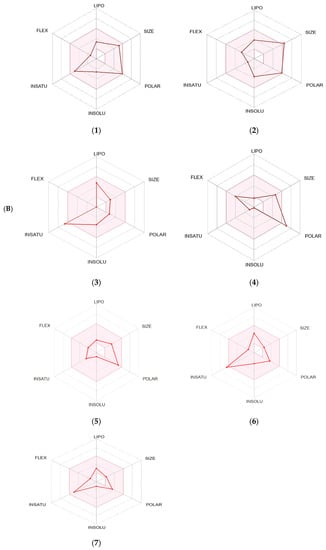 A boiled egg diagram (A) and bioavailability radar (B) for compounds 1: ouabagenin; 2: corchoroside A; 3: xanthyletine; 4: prenyl arabinosyl-(1->6)-glucoside; 5: furaneol 4-glucoside; 6: methyl orsellinate; and 7: ginkgotoxin. A boiled egg diagram represents the passive gastrointestinal absorption (HIA) and brain penetration (BBB) in the function of the position of the molecules in the WLOGP-versus-TPSA referential. The white region is for a high probability of passive absorption by the gastrointestinal tract, and the yellow region (yolk) is for a high probability of brain penetration. Yolk and white areas are not mutually exclusive. In addition, the points are colored in blue if they are predicted as actively effluxed by P-gp (PGP+) and in red if they are predicted as a non-substrate of P-gp (PGP−). The bioavailability radar represents the drug-likeness of a molecule, with the pink area representing the optimal range for each property (lipophilicity: XLOGP3 between −0.7 and +5.0; size: MW between 150 and 500 g/mol; polarity: TPSA between 20 and 130 Å2; solubility: log S not higher than 6; saturation: fraction of carbons in the sp3 hybridization that is no less than 0.25; and flexibility: no more than nine rotatable bonds for compounds).