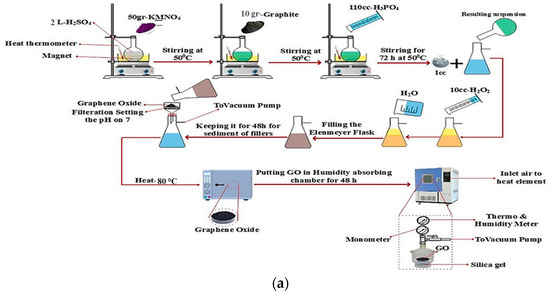The modified Hummer’s method was used to prepare GO. First, 2 L of H2SO4 were poured into a round-bottom flask and stirred simultaneously at a temperature of 50 °C with a rotation of 300 rpm. In the next step, 50 g KMNO4 was added to the H2SO4 in the flask. Then, 10 g of graphite was slowly added to the stirring suspension. In the next step, 110 mL of H3PO4 was added to the above suspension and the suspension was stirred at 50 °C and 500 rpm for 72 h. Then, the suspension was transferred to an ice-cooled Erlenmeyer flask under vacuum (ice-cooled Erlenmeyer flask). In the next step, 10 mL of H2O2 was slowly added to the suspension, and the Erlenmeyer flask was filled with deionized water under vacuum. Then, the suspension was kept constant for 48 h to separate the fillers. Finally, the desired suspension was filtered, and to remove the metal ions, the remaining fillers were washed on filter paper with HCl solution. To neutralize the pH, the suspension was also washed with deionized water. In the final step, the material was dried in a heating oven at 80 °C for 1 h and then stored in a moisture-reduction chamber for 48 h. To reduce GO, the hot zone of a tube furnace is filled with fine dry powder of GO nanosheets. Ar gas is then continuously introduced into the tube while the temperature is increased by 5 °C per minute until it reaches a temperature of about 350 °C. Therefore, the GO should be kept at the above temperature for 30 min to eliminate the oxygen domains and shorten the gap. After the tube reached room temperature (RT), the exfoliated GO powder was collected and stored in the desiccator for further use. First, 50 mg of the resulting solid was sonicated in 500 mL of water in a continuous supersonic bath for 0.5 h. Because the material is highly fragmented when the tip is inserted directly into the medium, bath sonication is preferable to advanced sonication. A total of 250 mg of GO was gradually separated from the rest of the solution with vigorous shaking. Different reduction times (0.5 to 3 h) at a reduction temperature of 95 °C were investigated. To remove the excess of AC, the resulting black precipitates were washed for 0.5 h with distilled water at a rate of 3000 activities. The resulting suspension was divided into two equal parts and centrifuged at 1000 rpm for 0.5 h to produce a homogenized GO suspension (Figure 9). It was possible to use this suspension to produce rGO. Finally, rGO powder was prepared overnight and the precipitated material was dried at 80 degrees Celsius [28]. It was studied how GO dissolves. It illustrates how the primary chemical species changed over time at temperatures ranging from 1200 K to 3000 K. The degradation of GO at temperatures from 1200 K to 3000 K shows the great influence temperature has on the distribution of byproducts. At low temperatures, there are hardly any degradation products, which shows that GO is rarely decomposed. H2O and H2 are produced only in traces [77] (see Figure 9a,b).