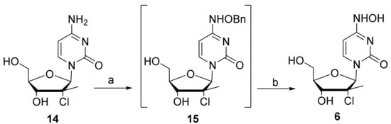 N4-Hydroxy-2′-deoxycytidine 1 [13], N4-hydroxy-2′-deoxy-2′-difluorocytidine 2 [14], N4-hydroxy-2′-deoxy-2′-fluorocytidine 3 [14], N4-hydroxy-2′-C-methylcytidine 4 [15], N4-hydroxy-2′-deoxy-2′-fluoro-2′-C-methylcytidine 5 [15], N4-hydroxy-4′-fluorocytidine 7 [16], N4-hydroxy-6-azacytidine 10 [17], N4-hydroxycytosine dioxolane 11 [18], and L- N4-hydroxycytidine 13 [14] were prepared according to reported procedures. On the other hand, N4-hydroxy-2′-deoxy-2′-fluoro-2′-C-chlorocytidine 6 was prepared by reaction of 2′-deoxy-2′-fluoro-2′-C-chlorocytidine 14 [19] with benzyloxy amine in dioxane and water and underwent further deprotection using cyclohexadiene as a source of hydrogen in the presence of Pd/C (Scheme 1).