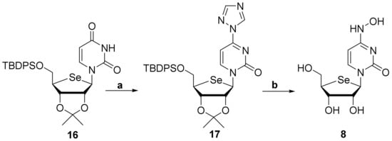 N4-Hydroxy-selenoriboside cytidine 8 was prepared according to the chemistry described in Scheme 2. Compound 16 [20] was reacted with POCl3 and 1,2,4-triazole in the presence of Et3N to give 4-triazolo intermediate 17 which was reacted with hydroxylamine for 20 min and then deprotected under acidic conditions to obtain the desired compound 8 in 49% yield over two steps.