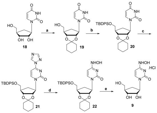 Compound 9, the carbocyclic version of NHC, was prepared by following the chemistry described in Scheme 3. Carbocyclic uracil analog 18 [21] was 2′,3′-protected using cyclohexanone in the presence of p-toluenesulfonic acid (p-TSA) and then 5′-protected using tert-butyl(chloro)diphenylsilane (TBDPSCl) in the presence of 4-dimethylaminopyridine (DMAP). Compound 20 was then reacted with POCl3 and 1,2,4-triazole in the presence of triethylamine to form 4-triazolo intermediate 21 which was reacted with hydroxylamine and then deprotected under acidic condition to obtain the desired compound 9.