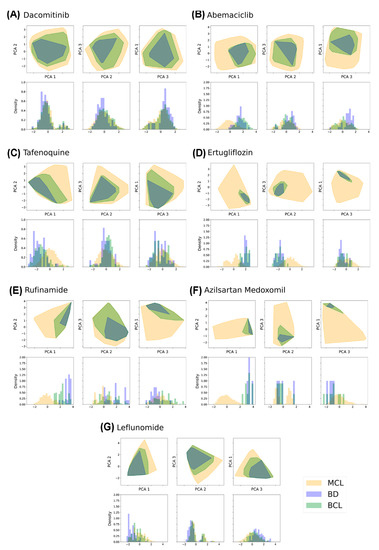 Quantifying the reduction of the MCL space that implies the use of BCL might be of key importance since its compounds are the ones genuinely expected to be synthetically feasible. This confirmation relies on the fact that BCL compounds include only the fragments coming from real studied candidates, constituting a more legitimate representation of the drug patent. For this purpose, the coverage of the MCL, BD and BCL libraries was compared by assessing their distribution along with each principal component and their density plots when projected on the space of the first three principal components (Figure 2). As expected, BD and BCL progressively improve the description of MCL, although neither of them, except for Dacomitinib and Leflunomide’s analogs (later discussed), significantly cover the chemical space derived from the Markush structure.