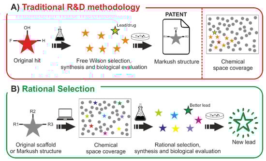 Hence, we defend an alternative or complementary approach that departs from the combinatorial library obtained from a theoretical Markush structure or from the fragment combination of and original scaffold explored in previous studies (which would ensure the synthetical feasibility of its analogs). Secondly, a computational study, involving space clustering or partitioning, is suggested to rationally choose a handleable number of compounds to synthesize and test that may unveil a better lead in unexplored regions. Thus, this methodology would better consider the chemical diversity of the original Markush set, being the rational selected compounds a significant representation for the issue of study or further repurposing approaches.