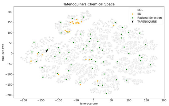 t-SNE representation of Tafenoquine’s chemical space, depicting the MCL compounds (grey), BD subset (orange), compounds selected by the rational selection of NBD analogs (green) and the original hit (black triangle).