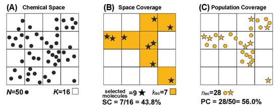 On the one hand, space coverage (SC) represents the percentage of selected (occupied) clusters or bins (koc) by a given number of selected compounds over the total number of partitions, (Equation (1)).
