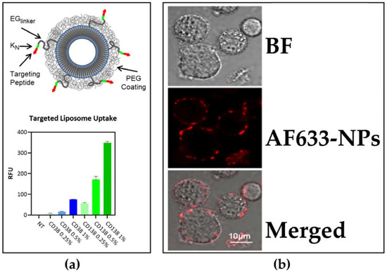 (a) CD38 or CD138 peptide-conjugated liposomal nanoparticle and its uptake by MM cells [123], Copyright 2020, Journal of Hematology and Oncology; (b) fluorescence reading of MM1s cells after 2-h exposure to AF633 anti-CD38 chitosan nanoparticles. BF (Bright field); AF633 (Red) [124], Copyright 2018, Journal of Controlled Release.
