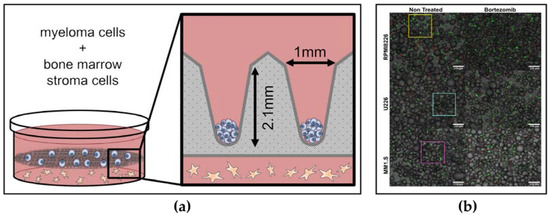 As a conventional approach, tumour migration and invasion can be investigated in 2D cell culture systems. However, developing 3D techniques is more successful in mimicking the tumour microenvironment. The conditions for proliferation, differentiation, and stimulation are more similar to the ones an in vivo environment in 3D cell cultures. For example, the 3D coculture of primary MM cells on a conical agarose microwell array exhibited a more robust proliferation than 2D and liquid overlay cultures (Figure 4a) [131]. Furthermore, Bortezomib and Auranofin caused more cytotoxicity in the 3D culture [131]. In a human bone marrow-like microenvironment produced by 3D bioprinting, MM cells were able to show better responses to Bortezomib [132]. Accordingly, scaffolds can be produced organically or synthetically from a basis where tumour cells can unite and mature. Scaffolds provide the cancer cell with ECM and TME task required for adhesion, signalling, and proliferation. Therefore, the type, surface area, and pore structure of the material used in the research are important. Spheroids are frequently used in cancer research to elucidate cell-cell or cell-ECM relationships and to interpret signalling pathways and gene expressions [151]. In a 3D culture platform designed with microspheres and microgels, MM cells were able to proliferate and also represented the resistance to Bortezomib (Figure 4b) and Dexamethasone [133]. Tumour-associated macrophages (TAMs) accumulate in the TME, reducing the immune response of T cells. In a 3D culture that mimics the cancer immune environment, the regulation of T-cell immunotherapy by TAM could be investigated [134]. Additionally, CAR-T cells that can be cocultured with spheroids can better recognize cancerous cells and contribute to immunotherapy. However, 3D techniques cannot provide the full picture of inter-tissue contact, concentration gradients, and mechanical properties in organs [152]. Due to the short lifespan of primary cells taken from patients, clinical trials are challenging but not impossible. By integrating 3D culturing technology with microfluidic and organ-on-chip devices, the processes that lead MM cells to Bortezomib resistance can be masticated in a more economical fashion within a short time.