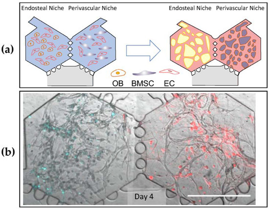(a) Bone-on-chip schematic representation. Cord blood-derived endothelial cells (EC) seeded with either hFOB (OB, Endosteal Niche) or BMSC (Perivascular Niche) form microvascular networks in a period of 4–7 days [144], Copyright 2022, Biomaterials. (b) BMoaC cultured with CellTracker™ Violet hFOB and Deep Red BMSC demonstrated stromal separation by niche [144], Copyright 2022, Biomaterials.