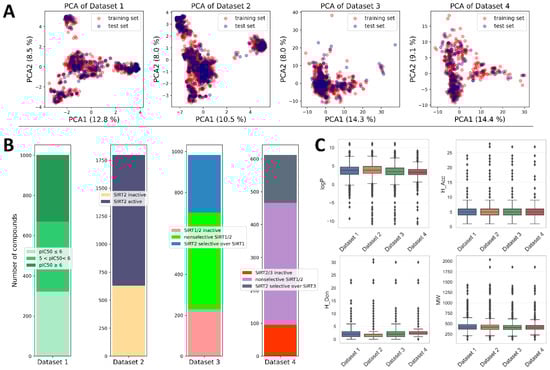 Descriptive analysis across different datasets indicated that most of the available compounds obeyed Lipinski’s rule of 5, with several outliers in each dataset (Figure 2) [34]. Compounds from the datasets were pre-processed, and molecular descriptors and fingerprints were calculated using approaches explained in the Section 3. Prior to modeling, all datasets were split into training and test sets using stratified random sampling (70% training set and 30% test set) to ensure the sampling from the same activity distributions. Principal component analysis of different datasets indicated that the splitting strategy was able to maintain equal coverage of the chemical space with training- and test-set compounds (Figure 2). Considering the slight imbalance inside classification datasets (Datasets 2–4), the SMOTE algorithm was used to oversample the minority classes by synthesizing new minority instances prior to training the classification models.