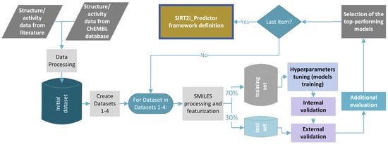 For the regression models, the IC50 values were converted into pIC50 (pIC50 = −log10 (IC50)), whereas for the classification models the IC50 values and Inh% were encoded into different classes. In this study, compounds were assigned to the “SIRT2 active” class if IC50 ≤ 50 µM, or Inh% ≥ 80% (if assayed at 200 µM), or Inh% ≥ 70% (if assayed at 100 µM), or Inh% ≥ 60% (if assayed between 50 and 100 µM), or Inh% ≥ 50% (if assayed bellow 50 µM). Compounds were assigned to the SIRT2 “inactive” class if IC50 ≥ 90 µM or Inh% ≤ 40% (if assayed above 100 µM). For multiclass models, the same criteria were applied with the records on SIRT1 and SIRT3 activities. In subsequent modeling steps, Datasets 1–4 were further divided into the training (internal) set (70%) and test (external) set (30%) using the stratified train–test split algorithm of the scikit-learn library (v 1.1.1) [60]. Class imbalance before training the classification models was accessed using the SMOTE (Synthetic Minority Oversampling Technique) algorithm from the imbalanced-learn library (v 0.9.1) [61].