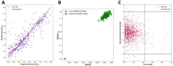 Top promising regression-based XGBoost:ECFP4 model. (A) Plot of experimental vs. predicted pIC50 values; (B) results of Y-scrambling; (C) applicability domain of the model. Dashed line indicates the leverage-threshold value (h*).