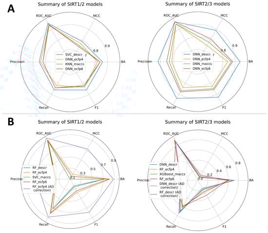 In alignment with the general protocol (Figure 3), all previously mentioned ML algorithms and molecule features were used to build and validate selectivity models. Two types of models were built: a SIRT1/2 selectivity model and a SIRT2/3 selectivity model. Due to the limited number of compounds with concomitant SIRT1/2/3 records accompanied by significant class imbalances, a joint SIRT1/2/3 model was not built. A total of 270 Mordred descriptors was selected for SIRT1/2 selectivity models, whereas 316 Mordred descriptors were selected for SIRT2/3 modeling (Supplementary Materials, Table S3). Fingerprints were used without further reduction of the number of beats. Selectivity models were built as multi-class prediction models, where different classes represented selective SIRT2, non-selective SIRT1/2 or SIRT2/3 and SIRT1/2, or SIRT2/3 inactive compounds (Figure 2). Similar to the VS binary models, external and internal predictive performance of selectivity models was evaluated using the same set of statistical parameters (Figure 6 and the Supplementary Materials, Tables S6–S10). Internal validation parameters indicated good internal predictive performance of the trained model (Supplementary Materials, Table S6). Interestingly, for the selectivity models, models built with descriptors performed significantly better on external validation with the test set compared to the models built with topological fingerprints (Supplementary Materials, Tables S7 and S9), with a predominance of RF, DNN, and SVC ML approaches. It is more likely that physicochemical properties encoded in selected descriptors for each modeling approach played greater importance in selectivity than structural features of the molecules. It is interesting to note that DNN models achieved the greatest performance across all types of molecular features for the SIRT2/3 selectivity model, which indicates the ability of the deep learning approach to more efficiently learn from the limited number of training data (Dataset 4–the smallest dataset) (Figure 6A).