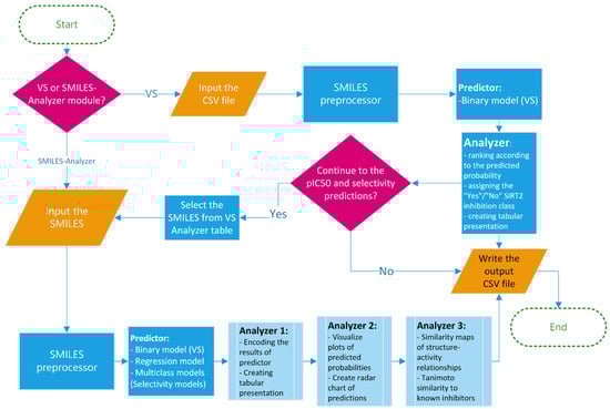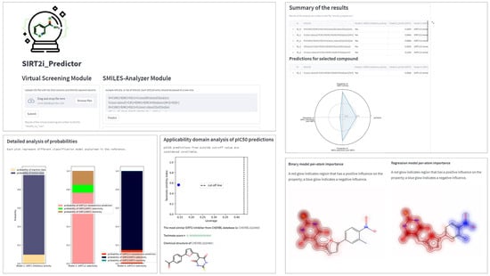 In order to increase the availability and ensure the best practice in the application of the created models, a framework for prediction of the activity/selectivity of novel compounds was defined and encoded into the Python-based application named SIRT2i_Predictor. The workflow of SIRT2i_Predictor is presented in Figure 7 and roughly consists of (1) a module selector, (2) a SMILES preprocessor, (3) predictors, and (4) analyzers. With the aim of making SIRT2i_Predictor easily accessible to the wider community, the appealing web-based graphical user interface (GUI) was created as well (Figure 8).