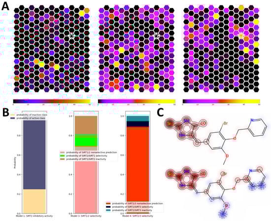 Comparison of SIRT2i_Predictor to the multi-structure SBVS approach. (A) Comparisons of the chemical space covered by ChEMBL SIRT2 inhibitors (left), SBVS virtual hits (middle), and SIRT2i_Predictor virtual hits (right); (B) analysis of probabilities obtained for virtual hits extracted from a unique portion of chemical space covered by SIRT2i_Predictor (star sign in (A)); (C) structure–activity relationships calculated using similarity maps for a binary model (upper plot) and a regression model (lower plot) for virtual hits extracted from a unique portion of chemical space (star sign in (A)). A red glow indicates a region that has a positive influence on the activity, whereas a blue glow indicates a negative influence.