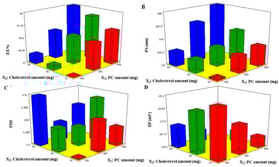 Response 3D plots (A–D) for the effect of PC amount (X1) and cholesterol amount (X2) on EE%, PS, PDI, and ZP. Abbreviations: PC: phosphatidylcholine, EE%: entrapment efficiency percent, PS: particle size, PDI: polydispersity index, and ZP: zeta potential.