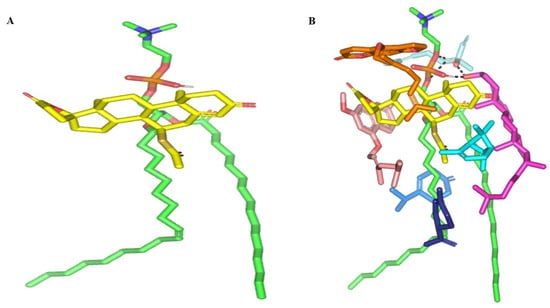 In presence of docked NP formulation additives and BEO constituents, the docking score for the investigated SP was increased up to −7.89 Kcal mol−1 which highlighted their preferential role in SP-PC complex stability. Notably, the electrostatic potentiality of PC phosphate moiety was satisfied via depicted extended hydrogen bonding with COL and LIN respective free hydroxyl group (Figure 3B). Double hydrogen bonding was depicted between LIN hydroxyl group and PC’s phosphate oxygen atom (bond length/angle; 1.8 Å/148° and 2.8 Å/120°). On the other hand, the COL’s OH group served as both hydrogen bond donor and acceptor that furnished singular hydrogen bond pairing with each of PC’s P-OH (1.3 Å/171°) and LIN’s OH group (1.8 Å/150°). It is worth noting that COL’s steroidal nucleus was extended along the PC’s acyl chains in a fashion being reported for the PC-COL system [26]. The presence of cholesterol with PC was reported to extend longitudinally along the PC acyl chains preventing the free movement of the latter hydrocarbon chains and causing the system to attain a liquid-ordered lamellar phase (Lo) [26,27,28].