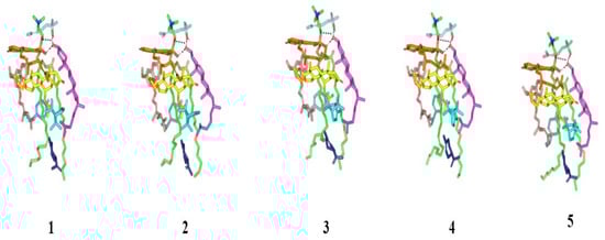 Conformational time evolution of PC-FC-BEO NPs across the all-atom molecular dynamics simulation. Thermodynamic movements of formulation components: SP (yellow) loaded on PC interface (green), COL (magenta), LIN (faint blue), LIM (dark blue), GTP (marine). Abbreviations: BEO: bergamot essential oil, NPs: nano-phytosomes, SP: spironolactone, PC: phosphatidylcholine, COL: cholesterol, LIM: limonene, LIN: linalool, GTP: γ-terpinene, 1 (0.2 ns), 2 (0.4 ns), 3 (0.6 ns), 4 (0.8 ns), and 5 (1.0 ns).