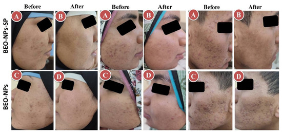 The recommended treatments were applied on the acne on both sides of the face for 2 months. The percent reduction for the comedones, inflammatory lesions, and total acne lesions was assessed. As demonstrated in Table 3 and Figure 6, BEO-NPs-SP formulation was topically applied on the left side’s acne lesions, revealing a percentage reduction of 100.00%, 93.31%, and 92.59% for the comedones, inflammatory lesions, and acne lesions, respectively. There was a significant reduction (p < 0.05) in the comedonal count, inflammatory lesions count, and the total count of acne lesions on the left side compared to the right side receiving the optimized BEO-NPs formulation, which displayed a percentage reduction of 59.17, 64.29, and 61.39 for the comedones, inflammatory lesions, and acne lesions, respectively. BEO-NPs-SP formulation was more powerful than BEO-NPs formulation on the comedones, inflammatory lesions, and total acne lesions, as noticeable from the significantly higher percent reduction for the former related to the latter (p < 0.05). Furthermore, neither irritation nor erythema was reported by any of the patients with any of the used formulae during the treatment (2 months). Moreover, patients reported that the formulae had retentive characteristics on the skin and were reasonably satisfactory.
