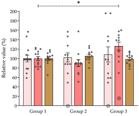 ) recorded in 5-min sessions. * p < 0.05, significantly different from group 1. Dunnett’s multiple comparison test after ANOVA. ⊗: discarded values. ngroup 1 = 14, ngroup 2 = 12, ngroup 3 = 12.