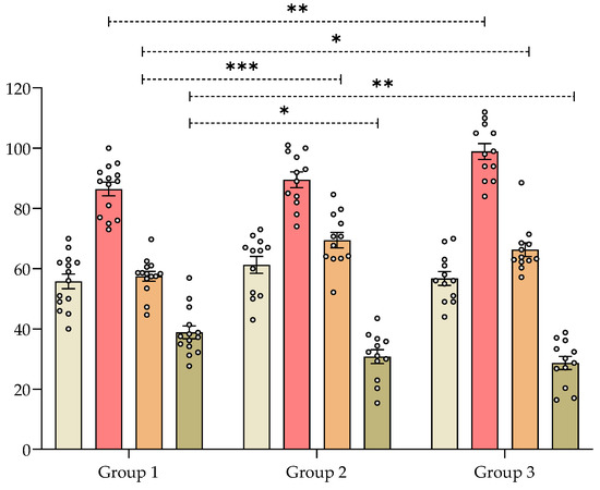 ) recorded in 8-min sessions. * p < 0.05, ** p < 0.008, *** p < 0.005 significantly different from group 1 (control). Dunnett’s multiple comparison test after ANOVA. ngroup 1 = 14, ngroup 2 = 12, ngroup 3 = 12.