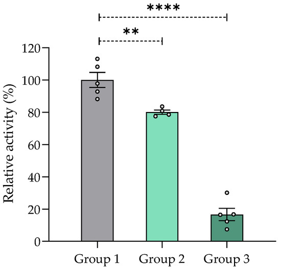 AChE inhibition (%) in mouse brain homogenates after chronic treatment with aqueous 1 extract of Valeriana carnosa (50 and 150 mg/kg/day in drinking water, groups 2 and 3, respectively). Results are expressed as mean ± SEM of AChE activity (Abs/min) in % relative to control group 1 (mice drinking water); ** p < 0.01, **** p < 0.0001, significantly different from group 1; Dunnett’s multiple comparison test after ANOVA. ngroup 1 = 5, ngroup 2 = 4, ngroup 3 = 5.