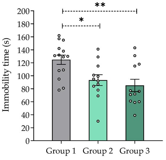 Effect of Valeriana carnosa aqueous 1 extract (50 and 150 mg/kg/day in drinking water, groups 2 and 3, respectively, on day 28 of treatment) in the tail suspension test in mice. Results are expressed as mean ± SEM, recorded in 6 min sessions * p < 0.05, ** p < 0.008, significantly different from control (group 1). Dunnett’s multiple comparison test after ANOVA. ngroup 1 = 14, ngroup 2 = 12, ngroup 3 = 12.