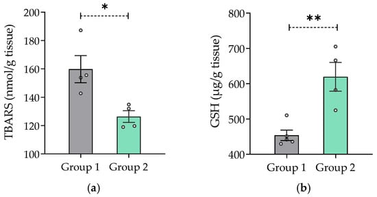In vivo antioxidant capacity of Valeriana carnosa aqueous 1 extract. (a) TBARS concentration expressed as nmol/g of tissue (ngroup 1 = 4, ngroup 2 = 4) and (b) GSH concentration expressed as µg/g of tissue (ngroup 1 = 5, ngroup 2 = 4) present in mouse brain homogenates that have ingested 50 mg/kg/day of Valeriana carnosa aqueous 1 extract in drinking water for 30 days (group 2). * p < 0.05, ** p < 0.005, significantly different from group 1 (control); unpaired t-test.