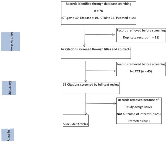 The search string that we used retrieved 78 bibliographic citations. We found 14 citations on PubMed, 30 on CT.gov, 19 on Embase, and 15 on ICTRP. Eleven citations were excluded because of duplicate records. Sixty-seven citations were screened by title and abstract because they were considered to be relevant. Forty-five citations were excluded because they were not randomized clinical trials. Two citations were excluded because of their study design, and twenty-five citations were also excluded because they had no outcomes of interest. Six relevant studies were considered for this meta-analysis. However, the study conducted by Lakkireddy [35] was retracted because the allocation method was not appropriate for randomized clinical trials. Finally, only five studies were included in this meta-analysis. Figure 1 shows the flowchart of the study selection process.