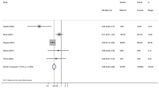 Forest plot of the association of protective effect of vitamin D supplementation with intensive care unit admission in patients hospitalized with COVID-19. CI, confidence interval; OR, odds ratio [26,32,36,37,38].