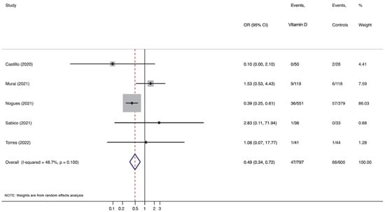 Each randomized clinical trial was investigated in detail for this meta-analysis. The randomized clinical trials that were taken into consideration were heterogeneous in different aspects. All studies included subjects hospitalized with COVID-19. Three out of five studies had a small sample size of patients. Only Nogues [38] recruited more than 800 patients, and Murai [26] included 240 subjects. The studies conducted by Murai [26], Sabico [32], and Torres [37] were multi-center studies, while the trials conducted by Castillo [36] and Nogues [38] were single-center studies. Castillo et al. [36] used an allocation ratio of 2:1. In contrast, the other studies used an allocation ratio of 1:1. In the study conducted by Sabico [32], patients were allocated to receive either standard vitamin D therapy (1000 IU) or 5000 IU of vitamin D for 14 days. Murai and colleagues randomly assigned a single oral dose of 200,000 IU of vitamin D3 or a placebo [26]. In the trial conducted by Castillo [36], eligible patients were allocated at a calcifediol:no calcifediol ratio of 2:1 to take oral 21.280 IU/day vitamin D on days 1, 3, and 7 and then weekly until discharge or ICU admission. In the study conducted by Nogues [38], the following were administered: 21.620 IU of vitamin D on day 1; 10.810 IU of vitamin D on days 3, 7, 15, and 30; or a placebo. In the study conducted by Torres and colleagues [37], the subjects received 2.000 IU/day or 10.000 IU/day of vitamin D. Forest plots are shown in Figure 2 and Figure 3.