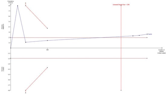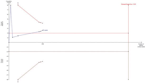 The TSA showed a clear association between vitamin D administration and the protective effect on ICU admission in the study conducted by Nogues. The pooling of randomized clinical trials reached a definite sample size. The positive result of TSA is conclusive. Figure 5 shows the second TSA, which examined vitamin D and mortality.