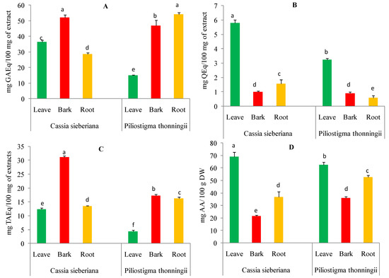 Content of polyphenols (A), flavonoids (B), condensed tannins (C), and vitamin C (D) in aqueous extracts of C. sieberiana and P. thonningii organs. Error bars represent ± standard deviation (SD) of three replicates. Means that do not share the same letter (a, b, c, d, e, f) in the same graph are significantly different by Tukey’s tests (p < 0.05).