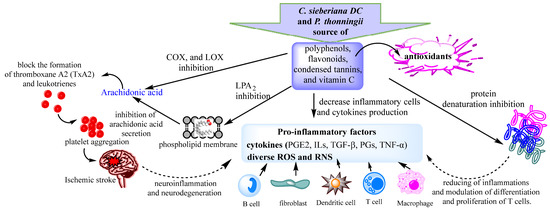 Inflammation can be categorized as acute or chronic and involves a multitude of biochemical events, including the local vasculature, the immune system, and various cell types present in damaged tissues. It is a complex biological response of vascular tissues to aggressive agents such as pathogens, damaged cells, or irritating compounds. Whatever the triggering factor, the mechanisms involved in the inflammatory process are common to all, and the standard signs of inflammation are increased blood flow, increased cellular metabolism, vasodilation, the release of soluble mediators, fluid extravasation, and cell influx [53]. Most of the in vitro analyses of plant species show their anti-inflammatory activity by their ability to inhibit the activity of lipase A2, cyclooxygenase (COX), and lipoxygenase (LOX). However, few plants have been studied for their potential to inhibit other inflammatory mediators, such as interleukins, the production of prostaglandins, thromboxanes, and leukotrienes [54].
