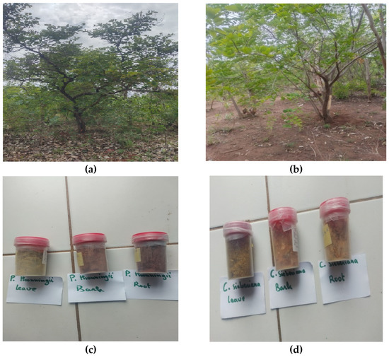 The plants: (a) P. thonningii and (b) C. sieberiana from the Hauts-Bassins region, Bobo-Dioulasso, Dienderesso forest. The powder extracts from leaves, roots, and bark of (c) P. thonningii and (d) C. sieberiana.