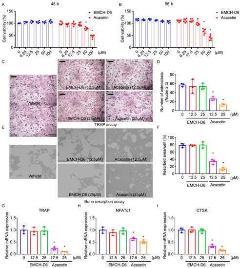 2.3. Acacetin Inhibited Osteoclast Differentiation and Bone Resorption
