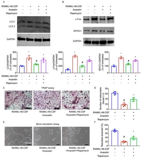 2.5. Acacetin Inhibited Autophagy in Osteoclast and Rapamycin Partly Abolished the Beneficial Effect of Acacetin on Osteoclast Differentiation and Bone Resorption