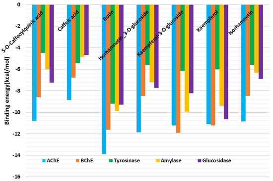 Molecular docking was performed to gain insights into the binding mode of the bioactive compounds and their interactions with the target enzymes. The binding energy (docking) score of each ligand against each enzyme is shown in Figure 2.