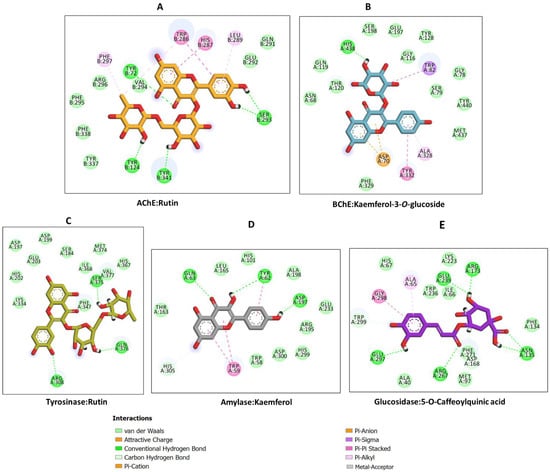 Protein–ligand interactions: (A) AChE and rutin, (B) BChE and kaempferol 3-O-glucoside, (C) tyrosinase and rutin, (D) amylase and kaempferol and (E) glucosidase and 5-O-caffeoylquinic acid.