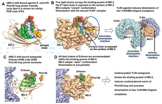 - Teghanemt, A.; Re, F.; Prohinar, P.; Widstrom, R.; Gioannini, T.L.; Weiss, J.P. Novel roles in human MD-2 of Phenylalanines 121 and 126 and Tyrosine 131 in activation of Toll-like receptor 4 by endotoxin. J. Biol. Chem. 2008, 283, 1257–1266. [Google Scholar] [CrossRef] [PubMed]
