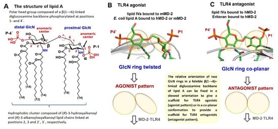 - Garate, J.A.; Stöckl, J.; del Carmen Fernández-Alonso, M.; Artner, D.; Haegman, M.; Oostenbrink, C.; Jimènez-Barbero, J.; Beyaert, R.; Heine, H.; Kosma, P.; et al. Anti-endotoxic activity and structural basis for human MD-2·TLR4 antagonism of tetraacylated lipid A mimetics based on βGlcN (1 ↔ 1) αGlcN scaffold. Innate Immun. 2015, 21, 490–503. [Google Scholar] [CrossRef] [PubMed]