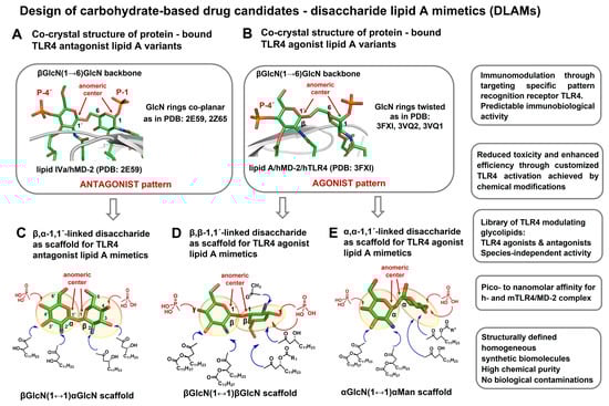 - Adanitsch, F.; Ittig, S.; Stöckl, J.; Oblak, A.; Haegman, M.; Jerala, R.; Beyaert, R.; Kosma, P.; Zamyatina, A. Development of αGlcN (1 ↔ 1) αMan-based Lipid A mimetics as a novel class of potent Toll-like Receptor 4 agonists. J. Med. Chem. 2014, 57, 8056–8071. [Google Scholar] [CrossRef] [PubMed]