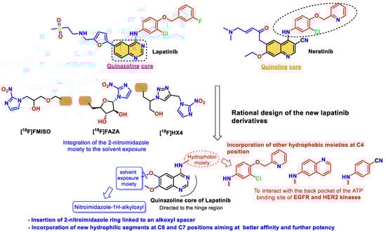Up to now, numerous 2-nitroimidazole containing small molecules have been reported to have potential antitumor activities, with some of them advanced into clinical trials for cancer, such as [18F]FMISO, [18F]FAZA, and [18F] HX4 (Figure 2) [,,]. Accordingly, to selectively inhibit EGFR and HER2, as shown in Figure 2, we concentrate our efforts in this research on designing and synthesizing new lapatinib derivatives bearing 6-(nitroimidazole-1H-alkyloxyl) moiety linked to the most common 4-anilinoquinazoline core.